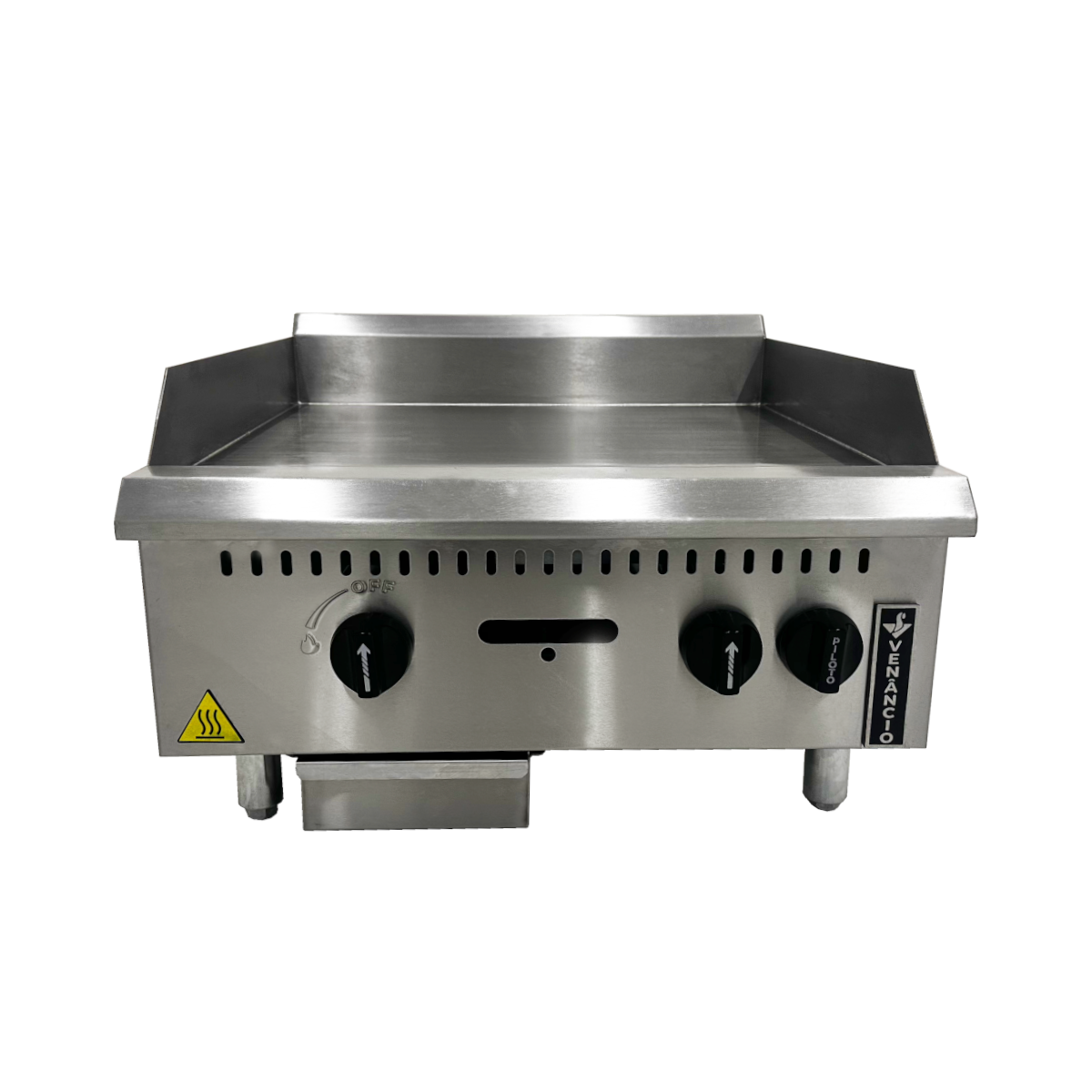 - Chapa Manual de Mesa Prime 60 Venâncio: painel e laterais em aço inox, borda anti-respingo inox 2 mm, chapa em aço carbono com espessura de 19,05, queimador esmaltado com registro independente;