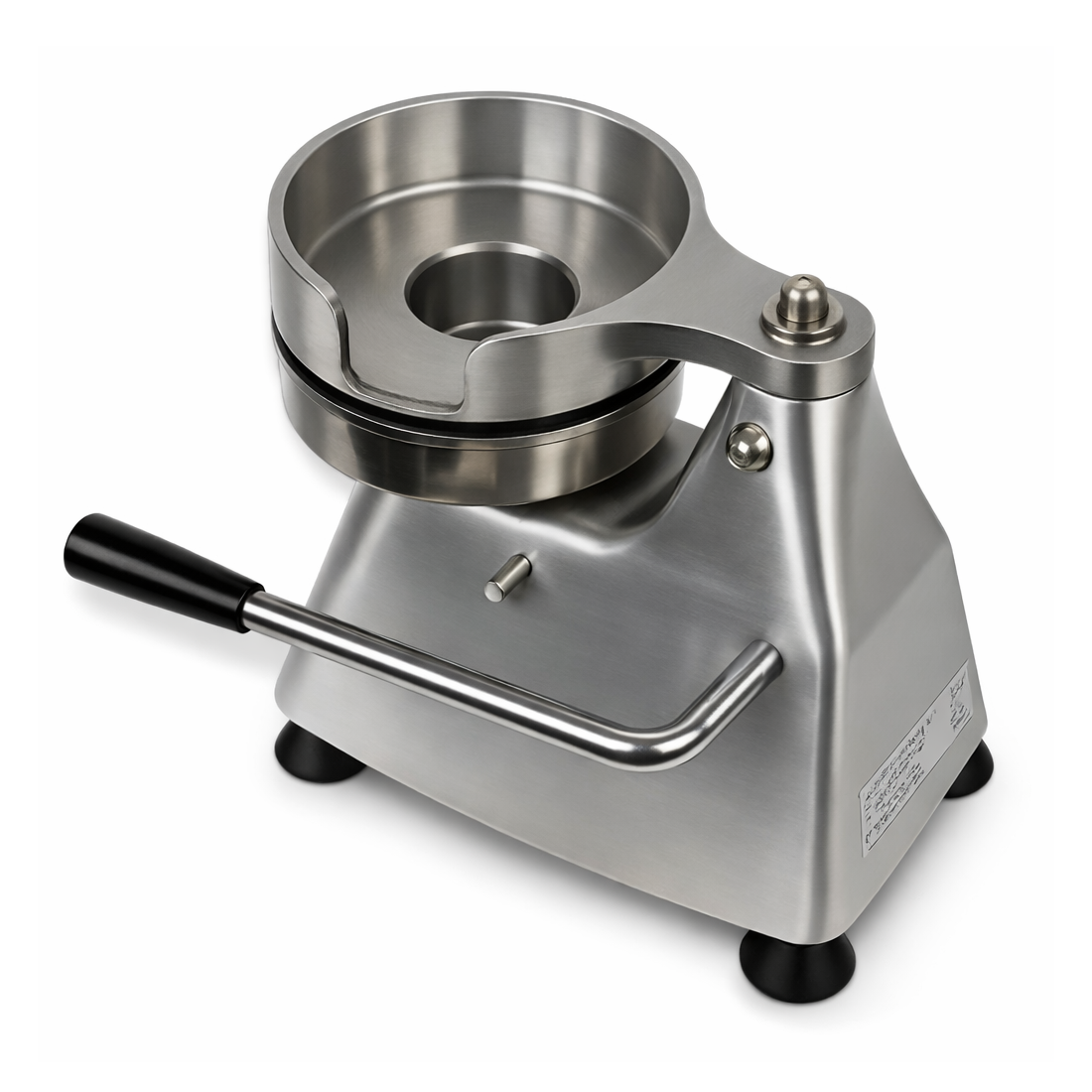 - Mecanismo de acionamento por manivela que eleva a base para remover o hambúrguer moldado da estrutura.