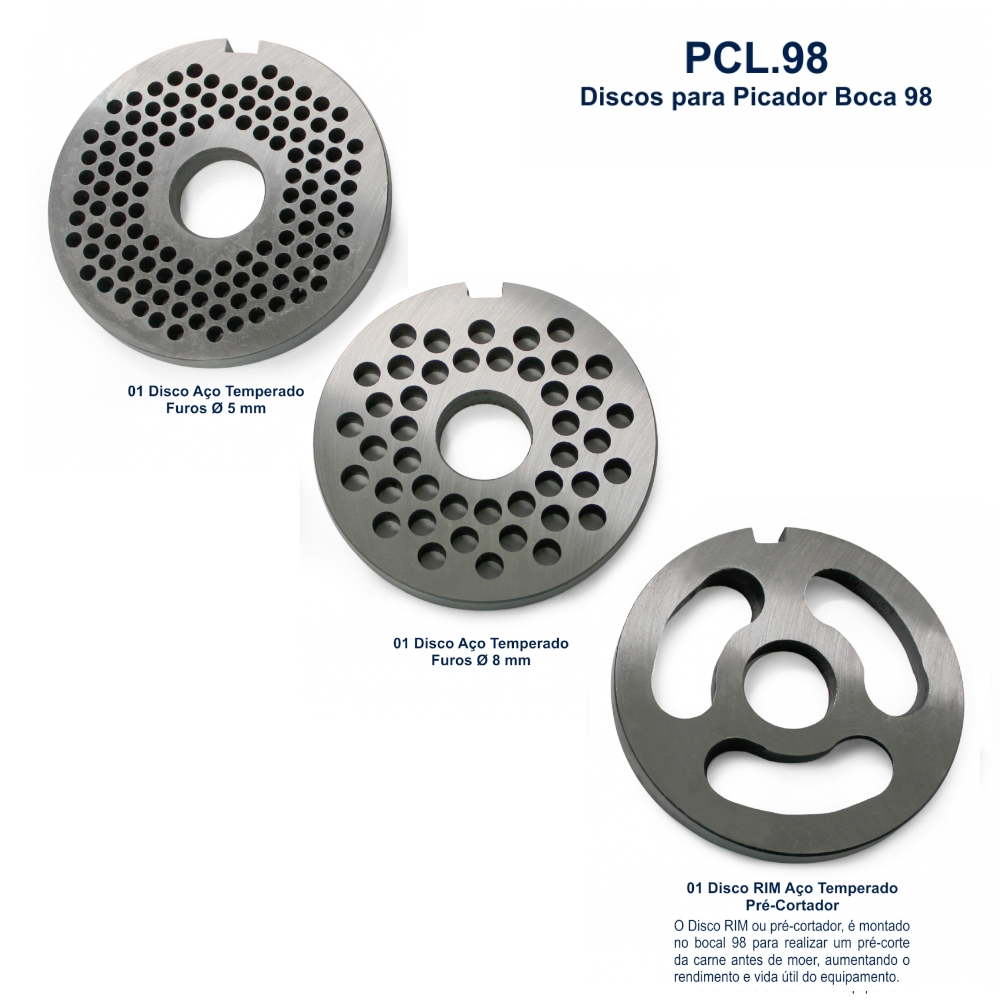 - Acompanha 01 disco com furos de 5 mm Ø, 01 disco com furos de 8 mm Ø e 1 disco RIM Pré-cortador (o disco RIM ou pré-cortador, é montado no bocal 98